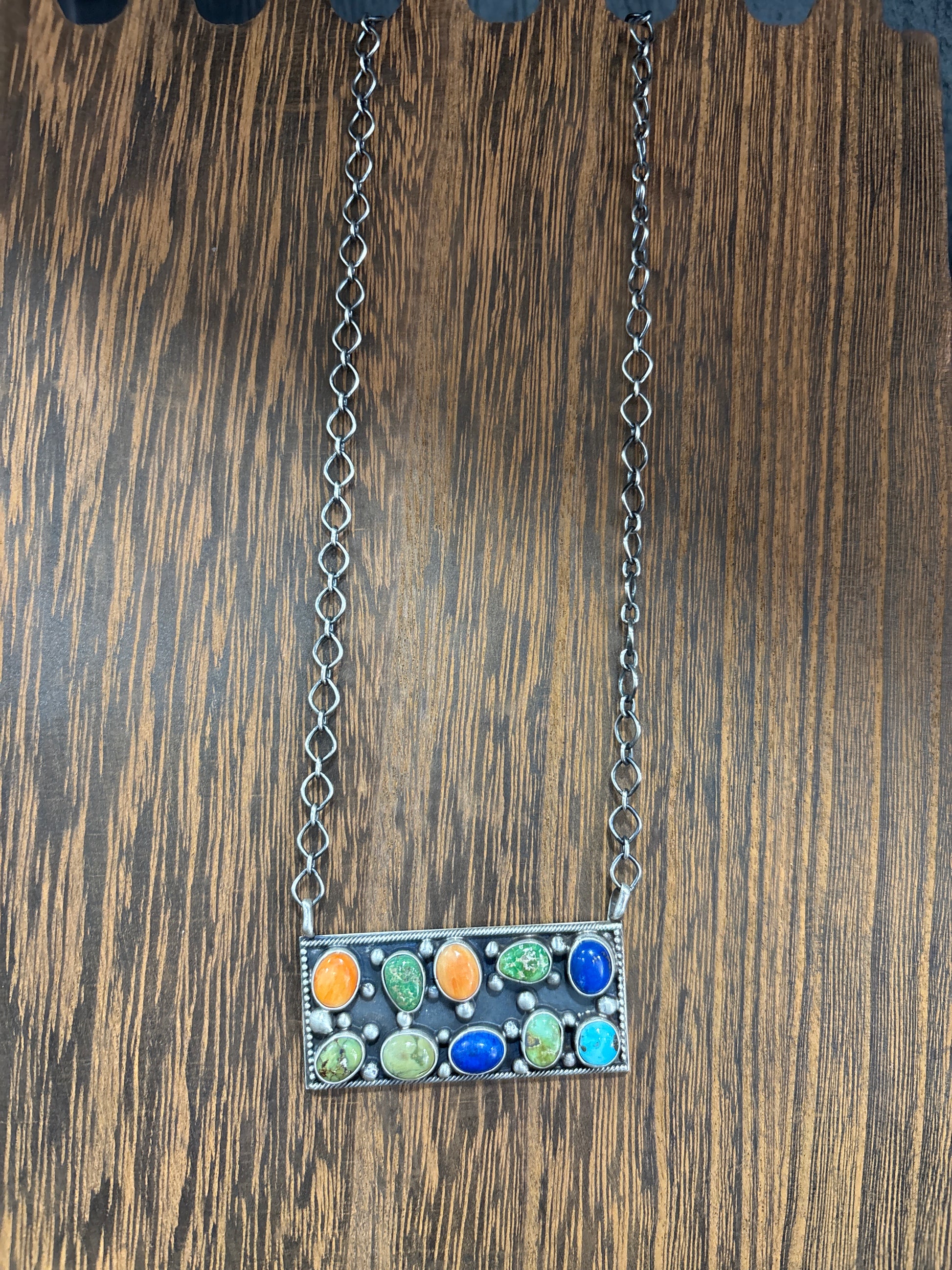 Navajo cluster bar necklace with turquoise, spiny oyster and lapis! Signed Shelia and stamped sterling! 20 inch chain, fully adjustable